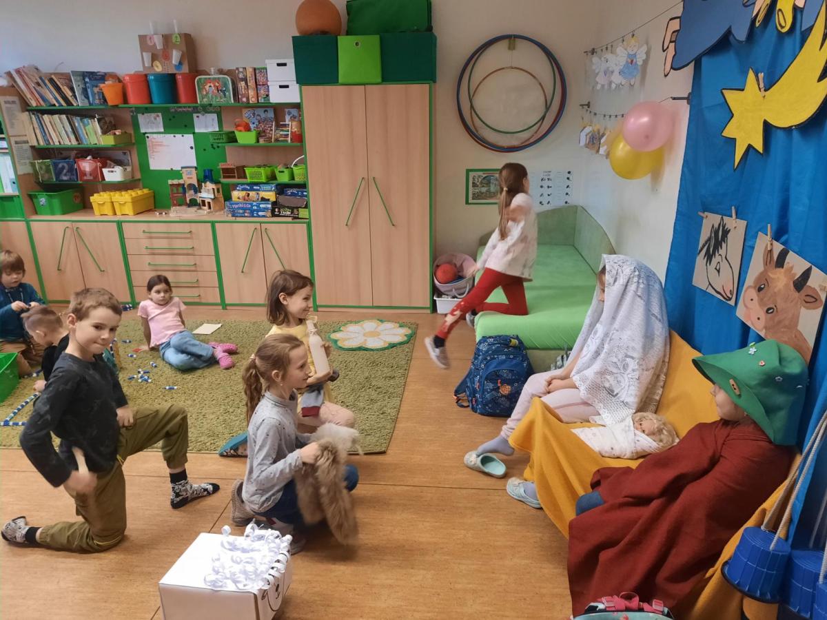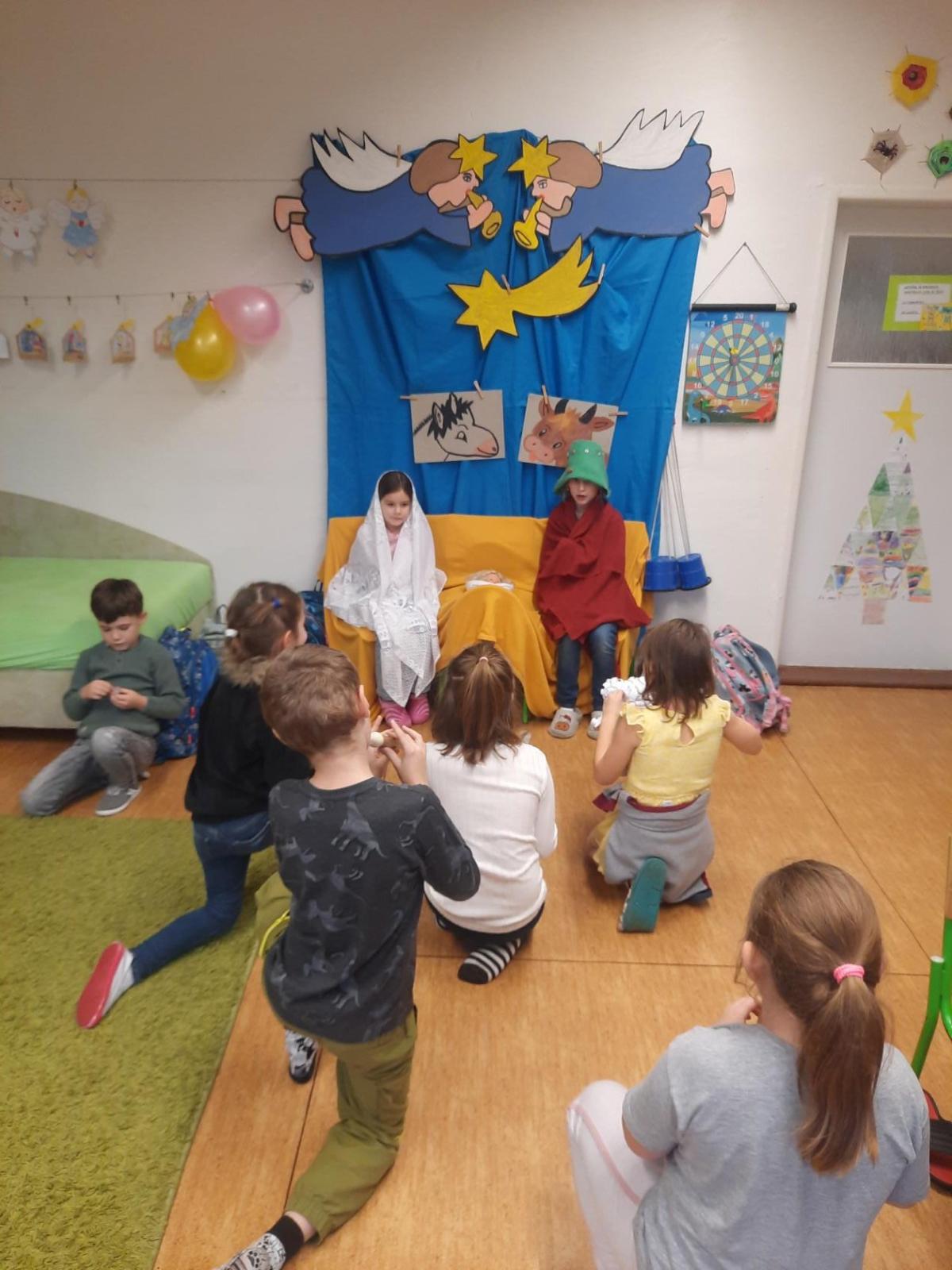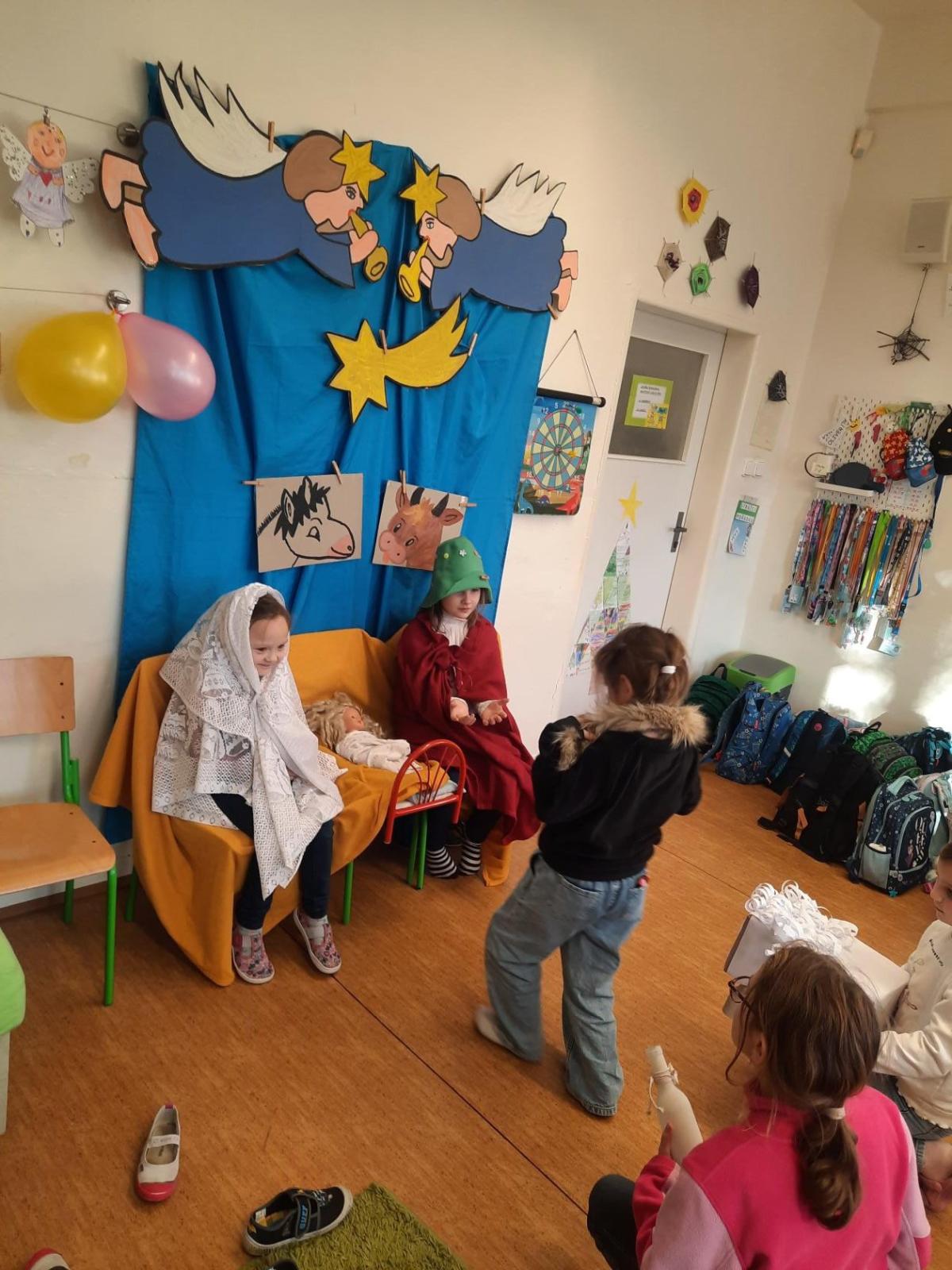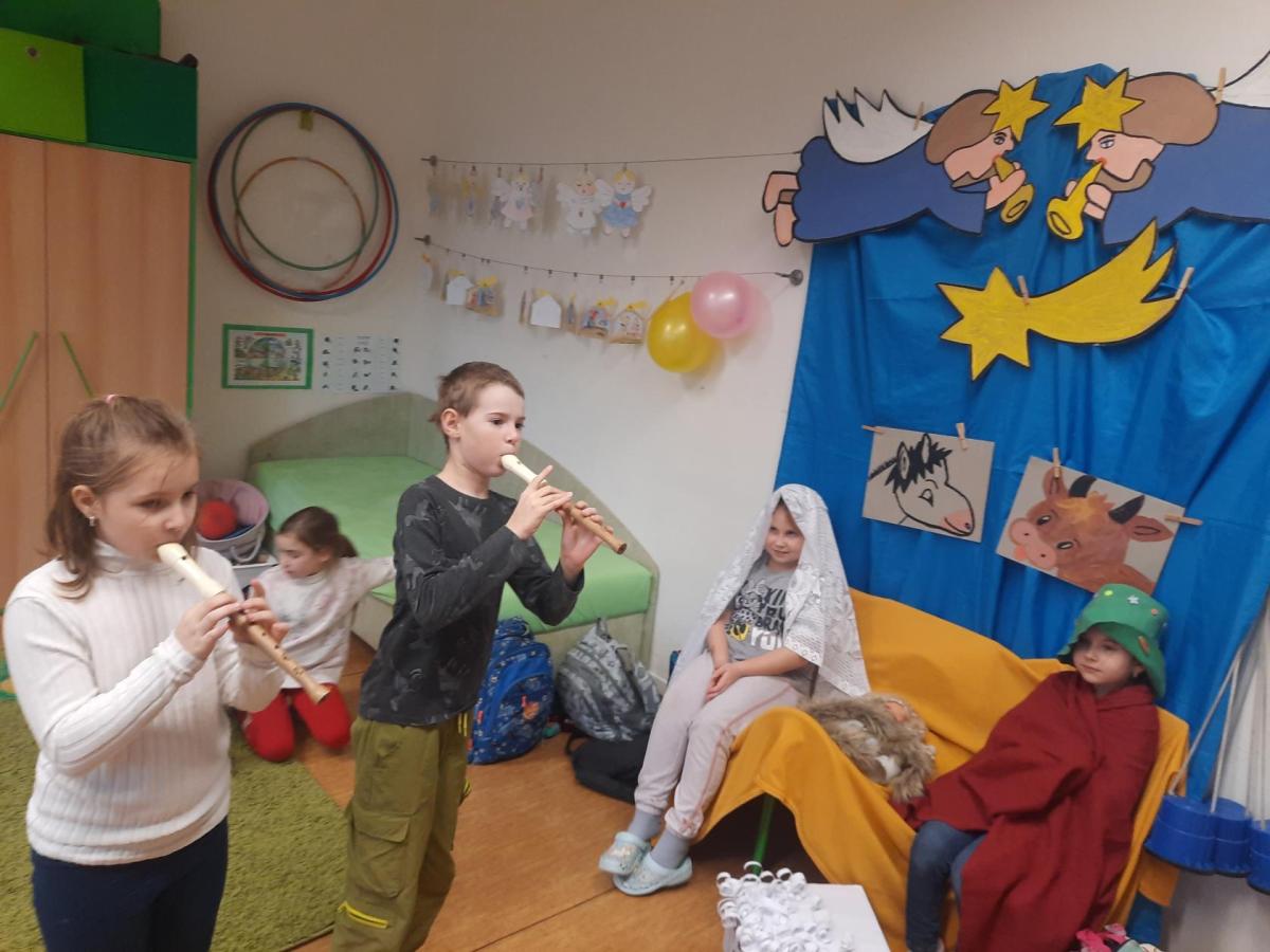 Zpívali jsme koledy a hráli Betlém. Nechyběla ani zábava a společné hry, oblíbené 3opice, kopaná v sedě, židličkovaná a tancování :-)