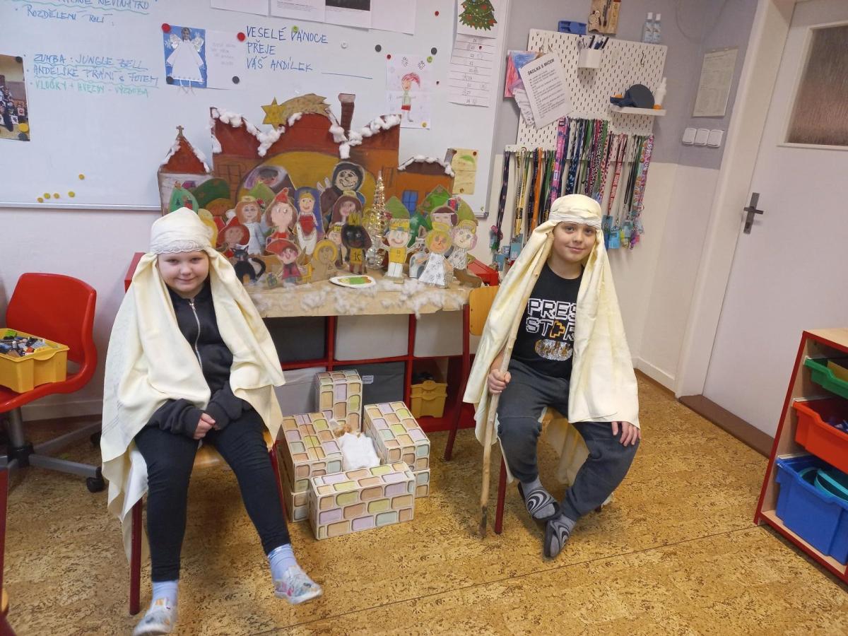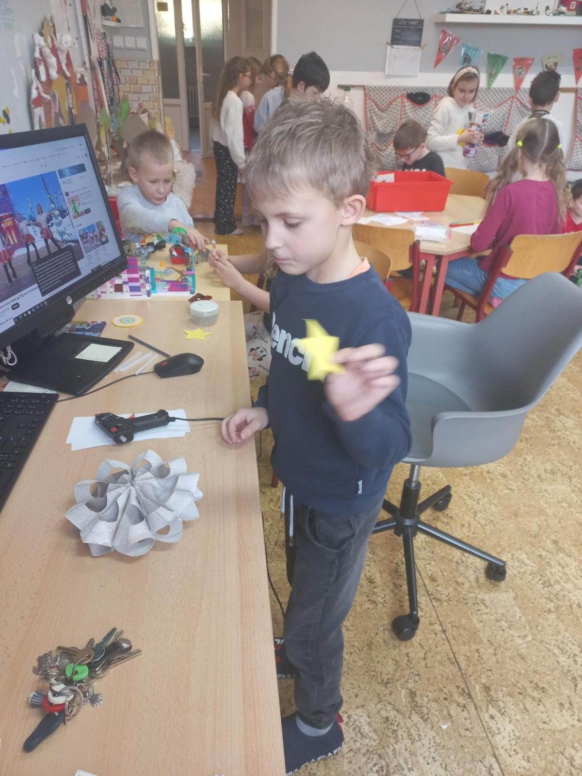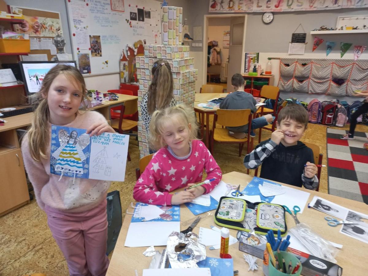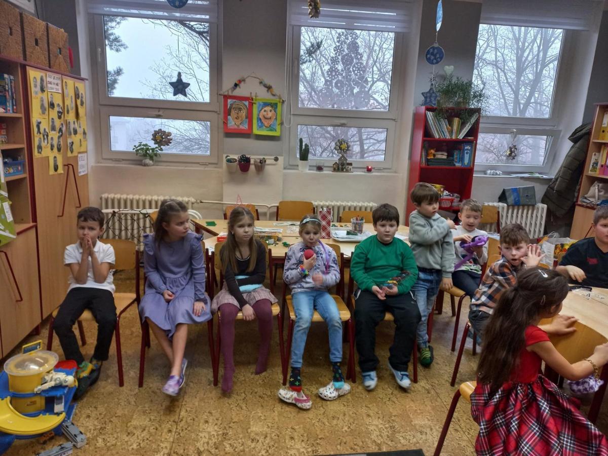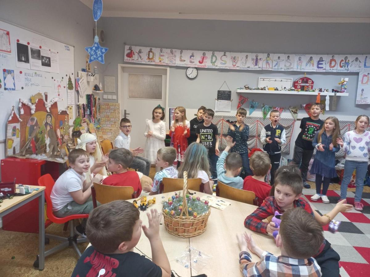 V prosinci jsme si užili krásný čas před nejhezčími svátky v roce - VÁNOCEMI! Po nadílce jsme se pustili do fotografování a výrobě přáníčka pod stromeček. Odvezli jsme 6 krabic od bot na charitativní akci a moc děkujeme za podporu těm, kteří přispěli dárečkem. Děti s napětím sledovaly, jak nám dárky přibývají a s chutí nazdobily krabice svými kresbami. Naše dvě skupiny perfektně spolupracovaly při nácviku dramatizace koledy: " Jak jsi krásné neviňátko". Představení jsme zahráli našim spolužákům a kamarádům ze IV.oddělení a společně jsme si zazpívali vánoční písně. Největší úspěch měla píseň Vánoční od Pokáče! Na jarmark jsme i s dětmi z výtvarného kroužku vyrobili lampičky a ozdoby. Prodejem jsme přispěli na další charitativní akci. Družina přispěla částkou 3000,- Kč. Moc děkujeme za podporu! Venku vládlo nevlídné počasí, na vycházky jsme vyrazili jen občas. Věřím, že o prázdninách si všichni užijeme sváteční radovánky a i sluníčko! Mějte se fajn a budu se těšit v novém roce 2026 - Dana