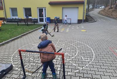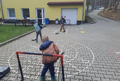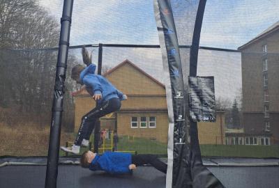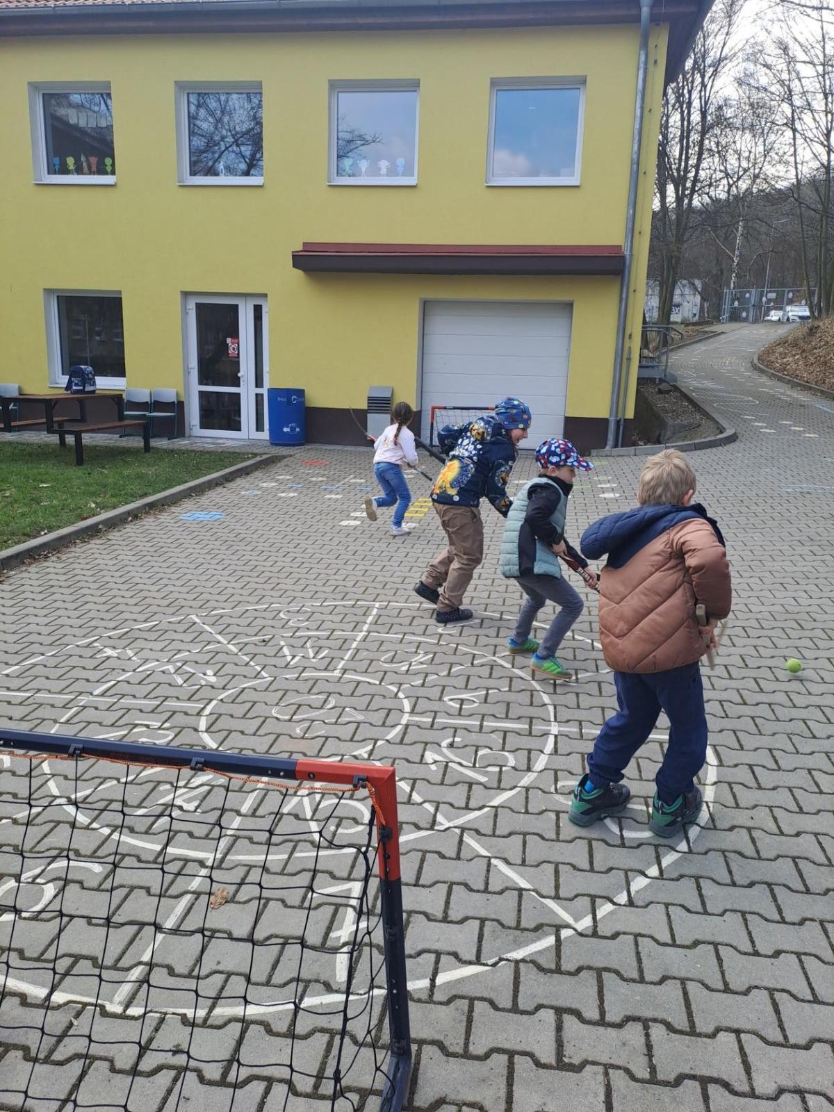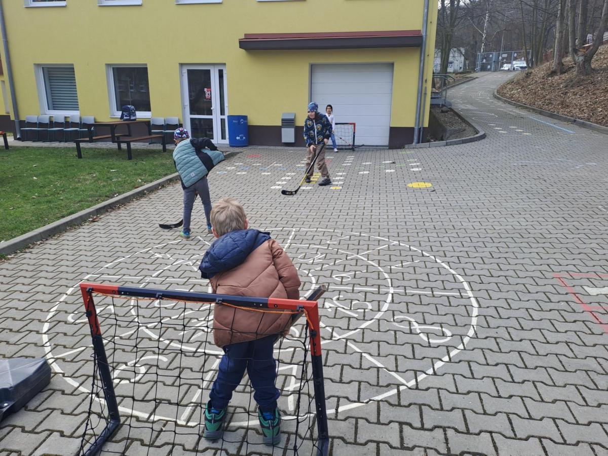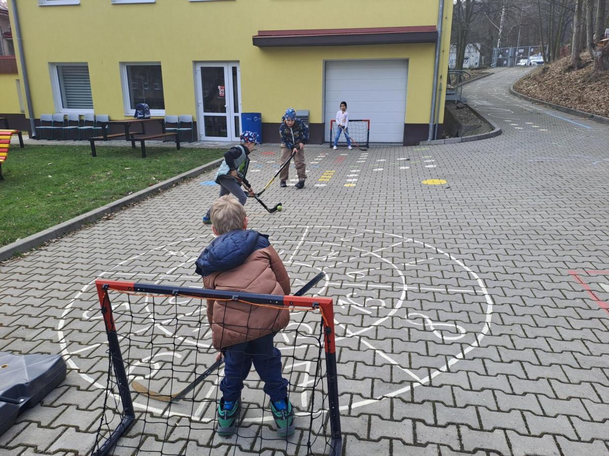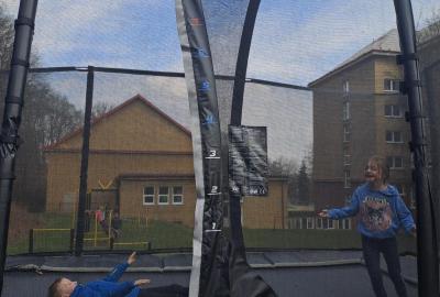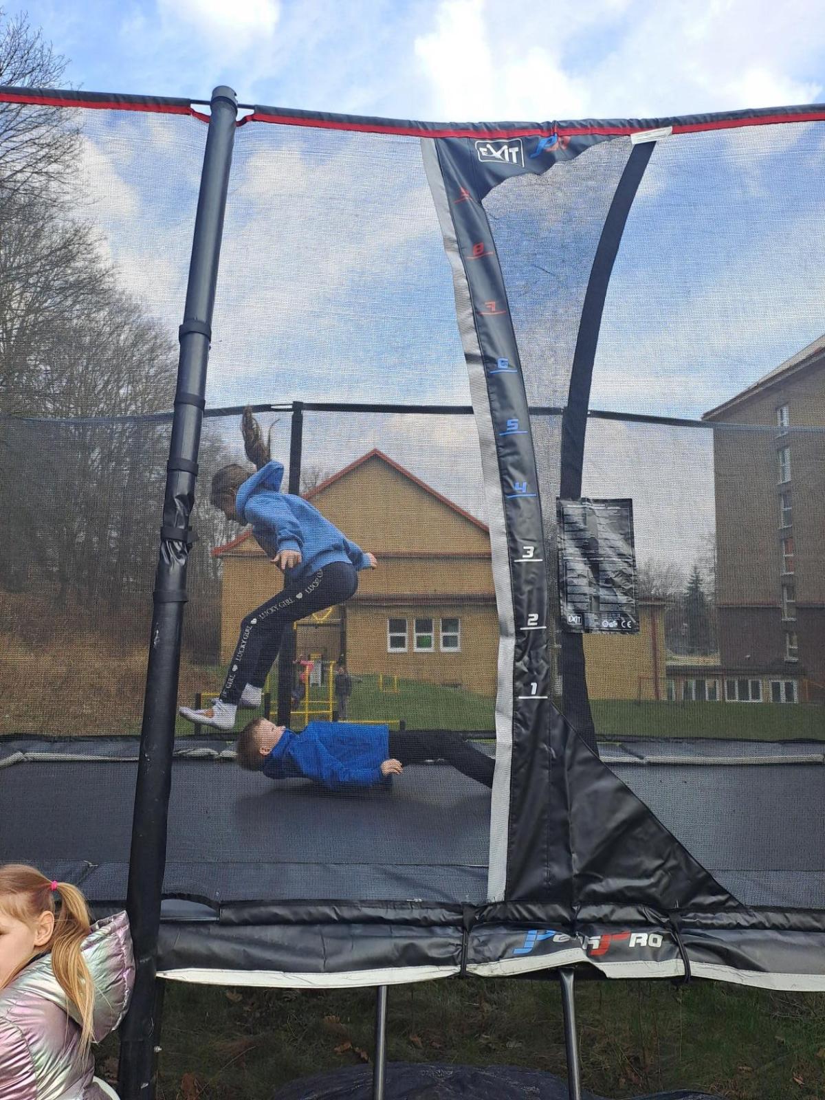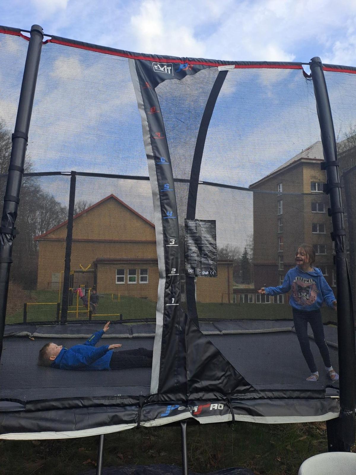 Na zahradě už skáčeme na trampolíně a hrajeme hokej.