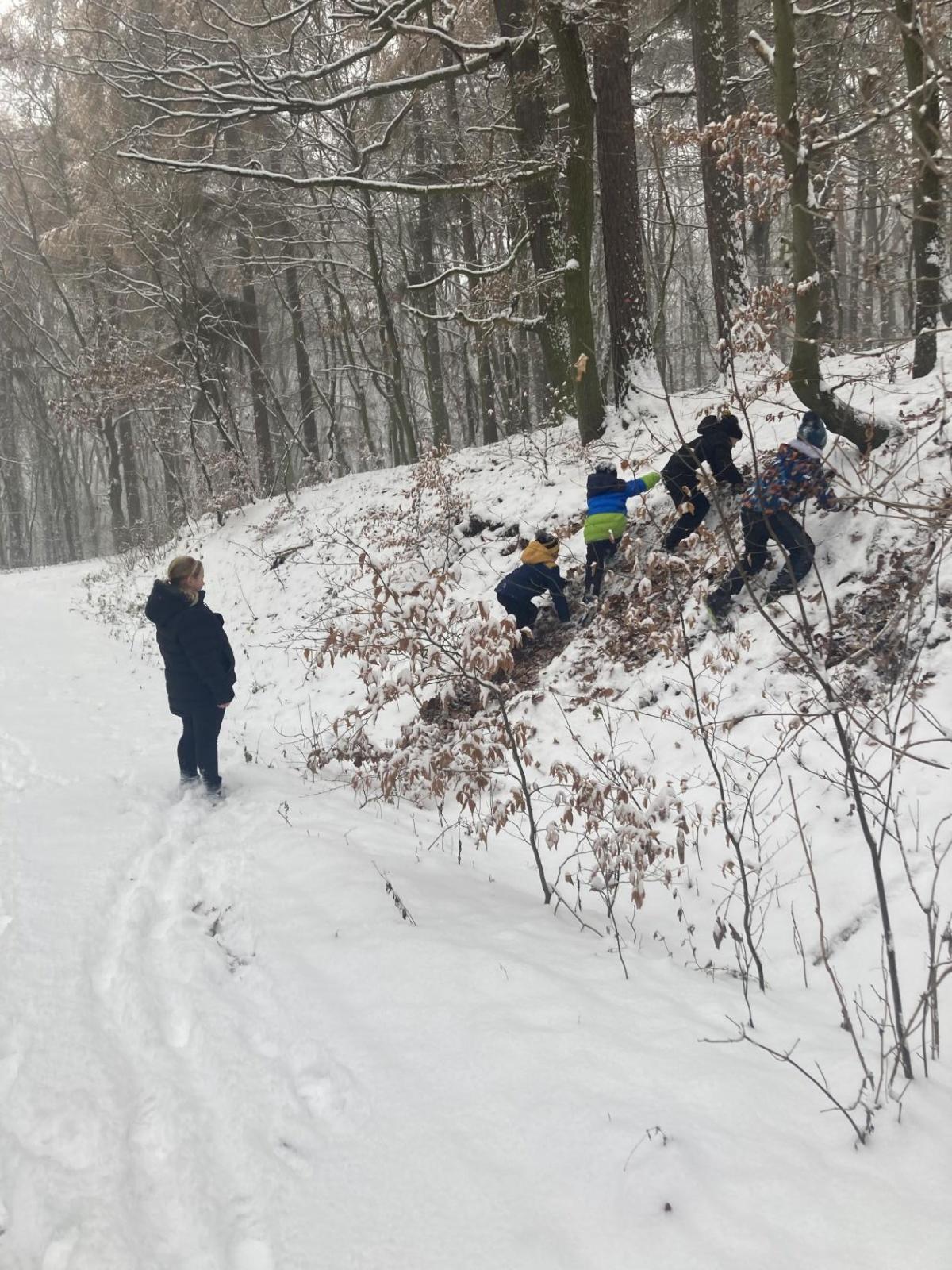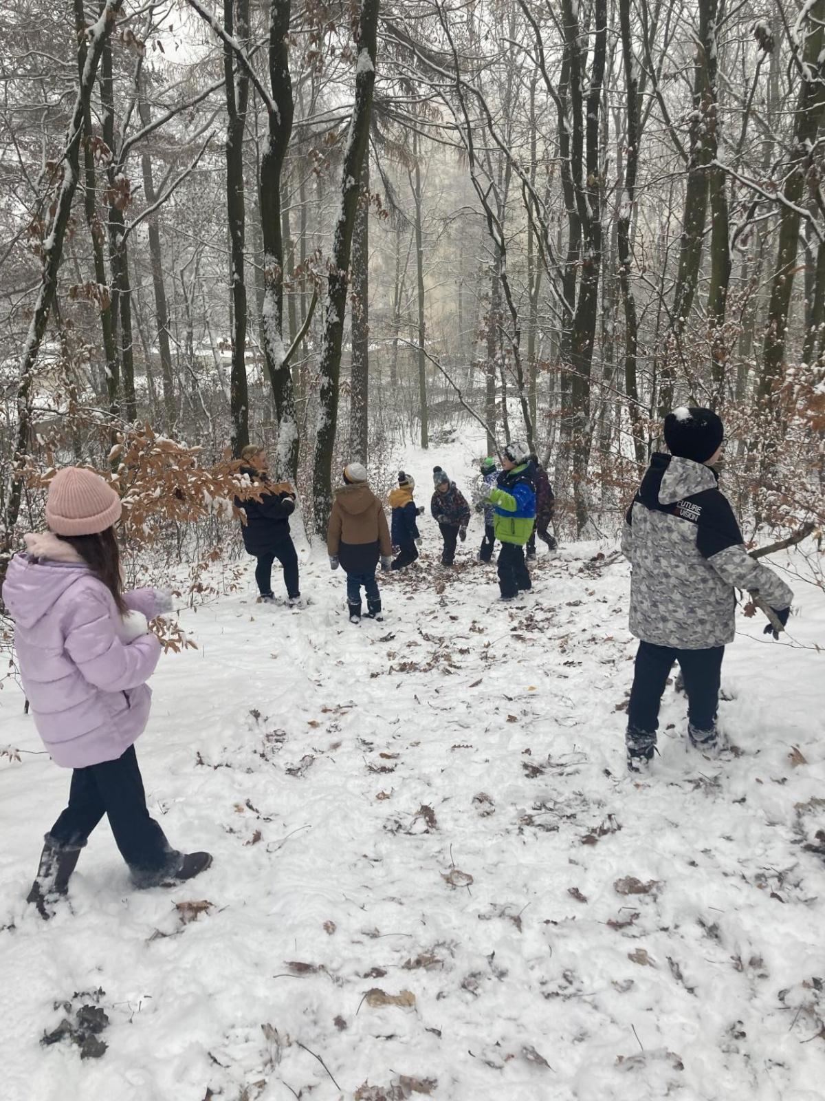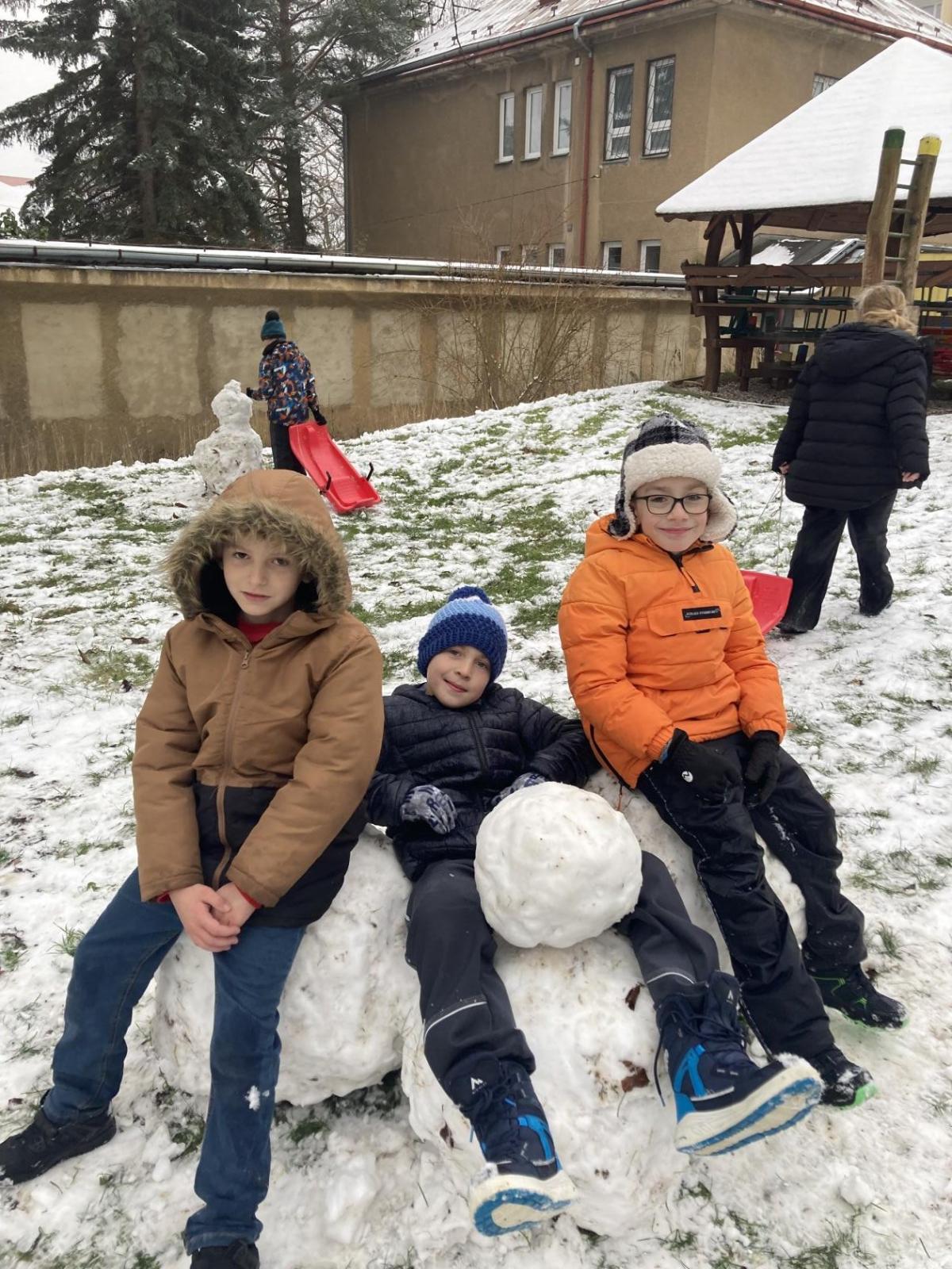 V adventním duchu jsme se vydali ozdobit školní vánoční stromeček v centru města. Hodně času jsme trávili venku – v lese, na Skalce i na školní zahradě. Tam jsme si užívali první sníh: stavěli jsme sněhuláky, koulovali se, dělali anděly ve sněhu a také bobovali.