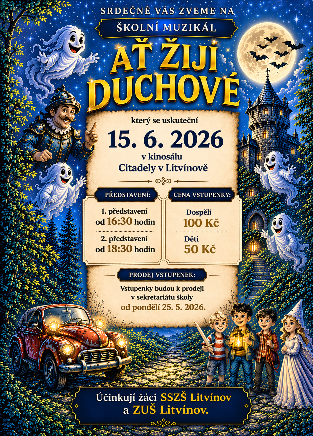 srdečně Vás zveme na školní muzikál Ať žijí duchové, který letos přináší něco výjimečného – poprvé se do něj zapojují děti napříč všemi ročníky společně se žáky ZUŠ Litvínov.