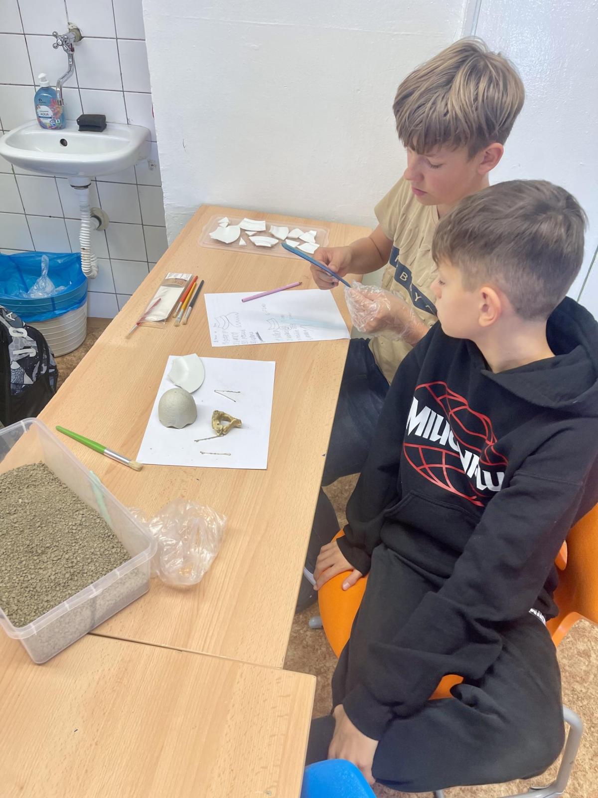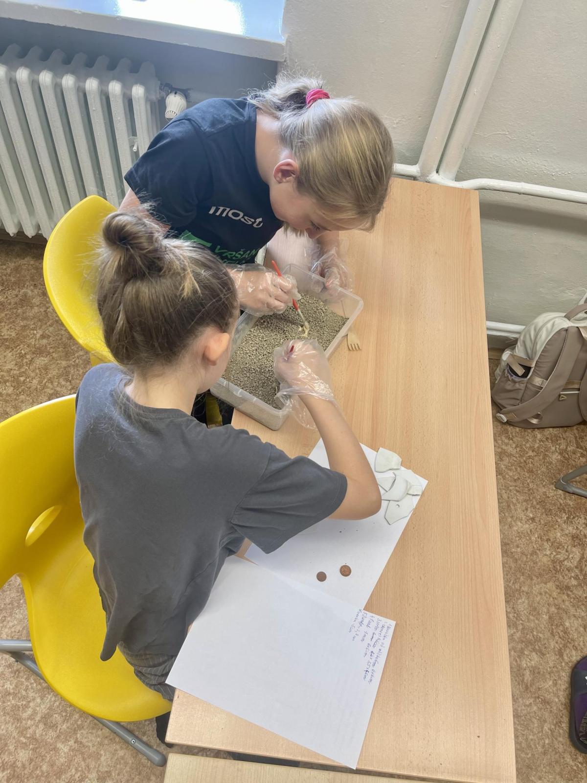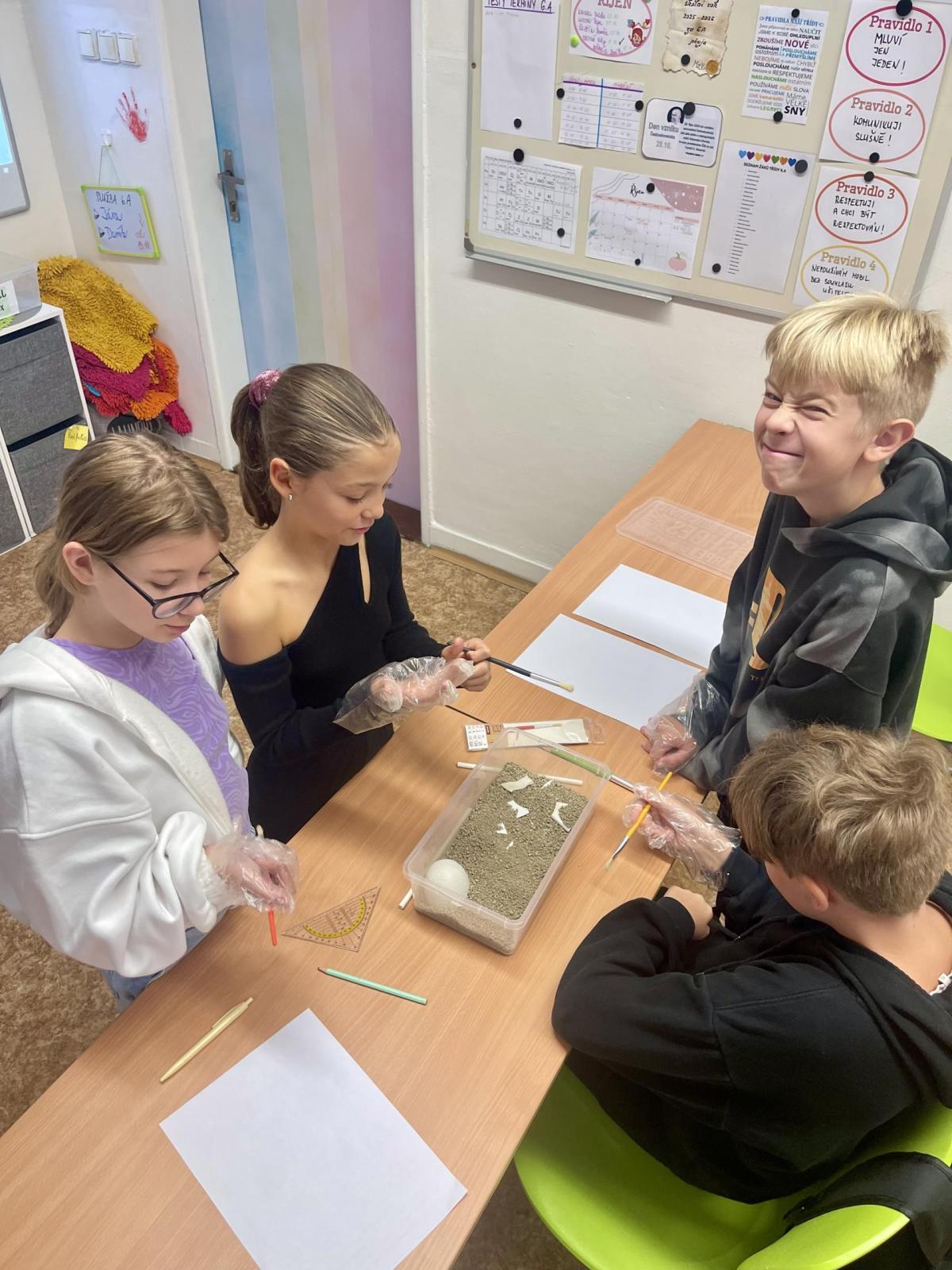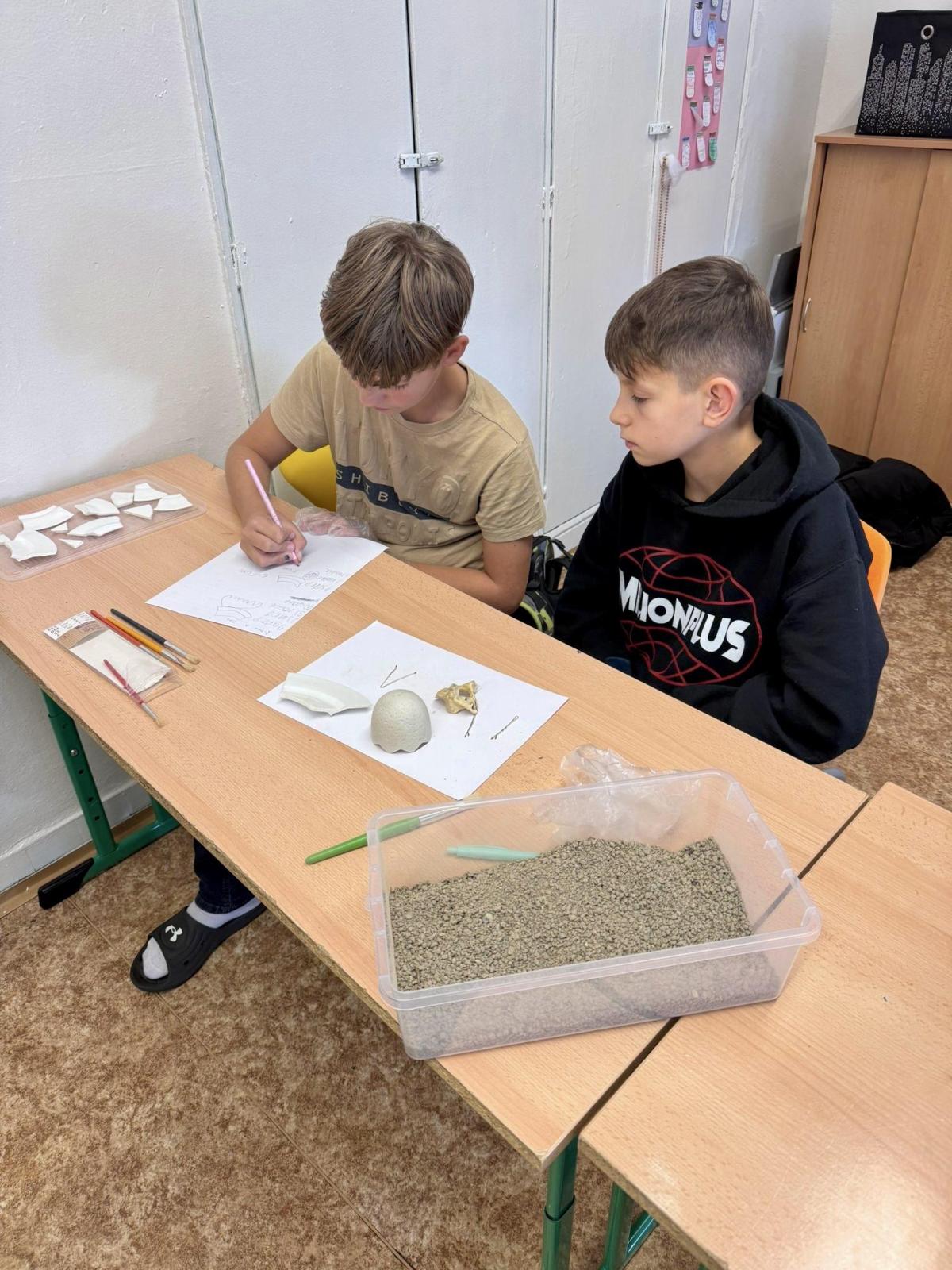 V dějepise jsme se pustili do dobrodružství jménem Staň se archeologem. Žáci si vyzkoušeli práci skutečných archeologů a s velkou dávkou trpělivosti odkrývali své vykopávky. Každý nález hmotného pramene samozřejmě pečlivě zaznamenávali. Tato zážitková hodina dějepisu nám pomohla lépe pochopit, jak důležité je bádání pro poznání minulosti.