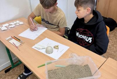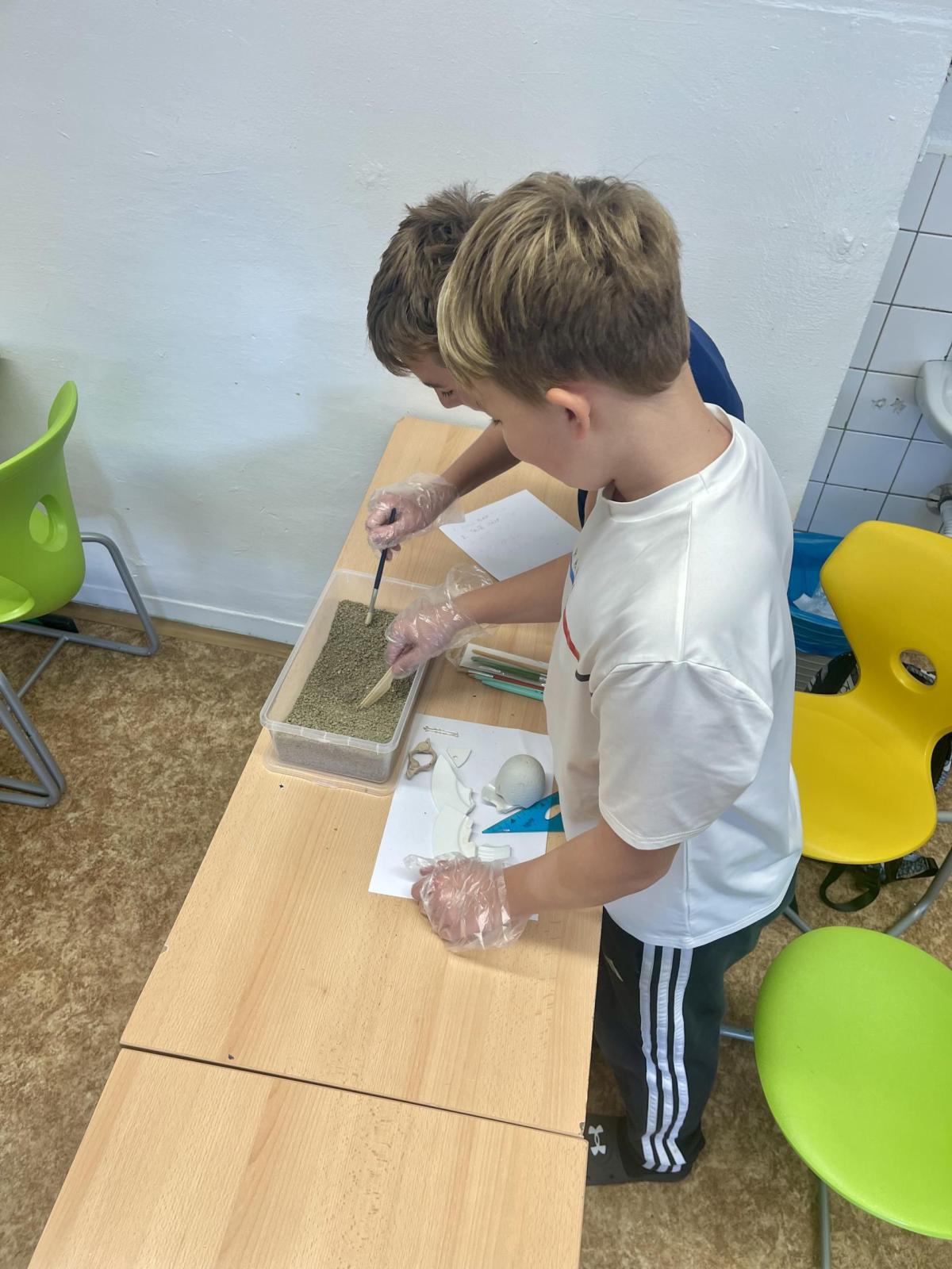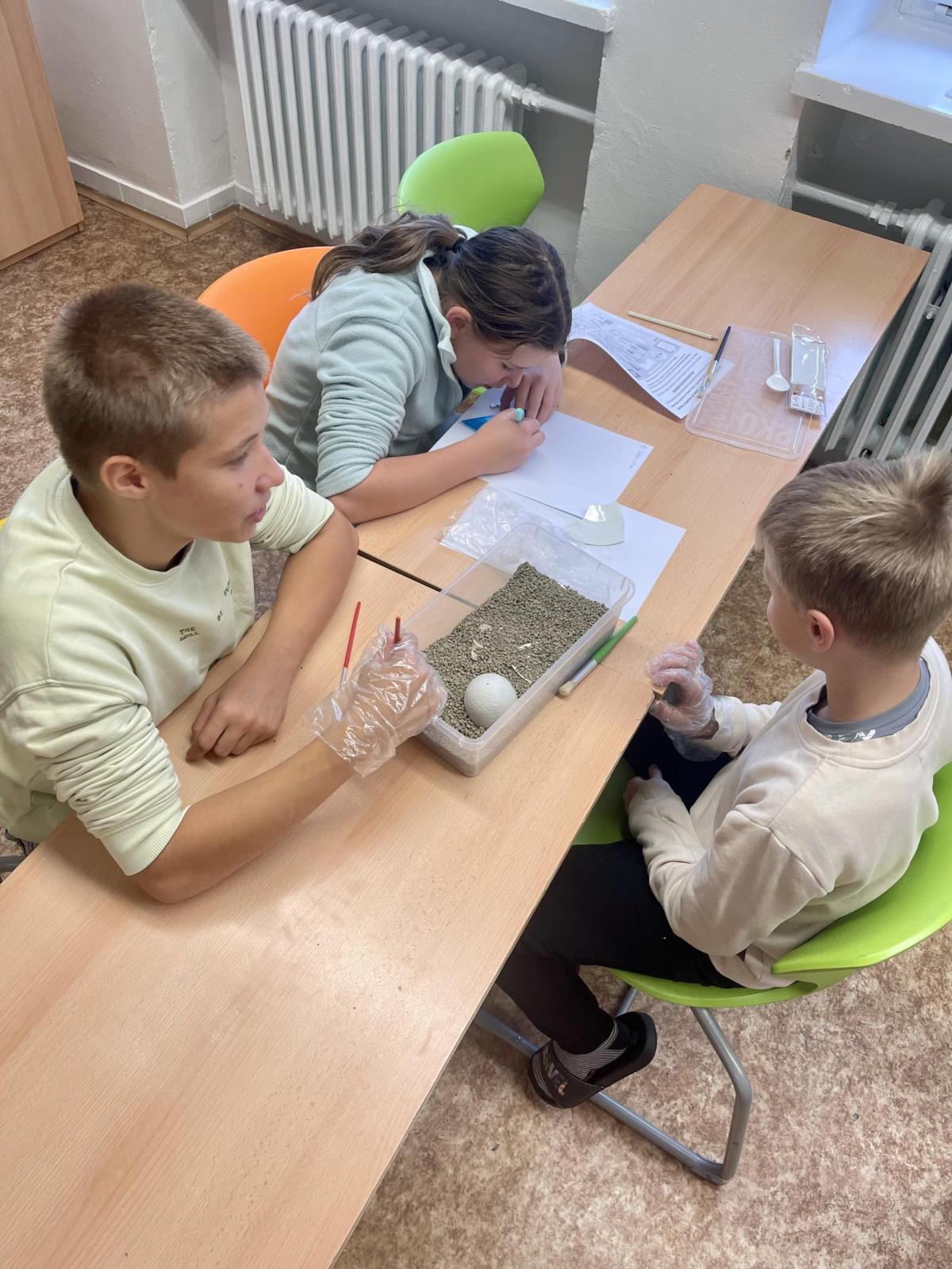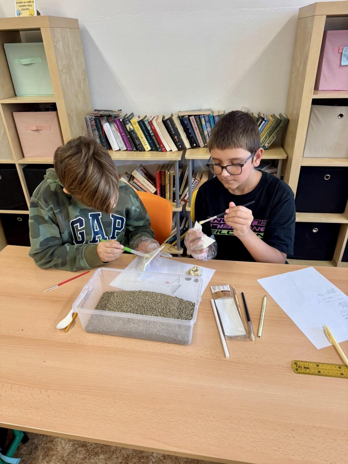 V dějepise jsme se pustili do dobrodružství jménem Staň se archeologem. Žáci si vyzkoušeli práci skutečných archeologů a s velkou dávkou trpělivosti odkrývali své vykopávky. Každý nález hmotného pramene samozřejmě pečlivě zaznamenávali. Tato zážitková hodina dějepisu nám pomohla lépe pochopit, jak důležité je bádání pro poznání minulosti.